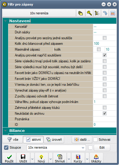Vytvoříme si tedy v okně Nabídka filtr. Ve filtru zadáme podmínky, aby se vracely jen takové zápasy, kde mají domácí nebo hosté sérii 10 zápasů bez remízy. K domu využijeme sekci filtru Bilance: