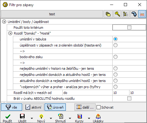 Další sekce filtru pro okno Nabídka umožňuje zohledňovat rozdíl hodnot pořadí v tabulce, získaných bodů nebo úspěšnosti v odehraných zápasech: