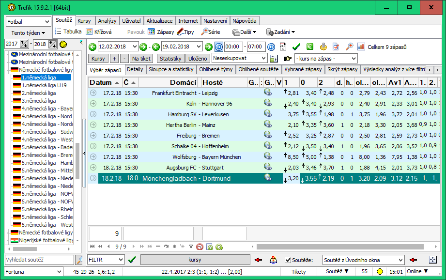 V následující ukázce bude představena práce s kurzy. Bude porovnáván průměrný kurz na zápas (ze všech kanceláří v Trefíku) a změna kurzu proti původně vypsaným hodnotám. Kurzy na zápasy se samozřejmě průběžně mění a Trefík obsahuje nástroje, kterými lze změny kurzů zahrnout do strategie výběru tipů.